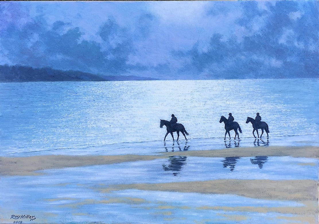 All That Glisters by Roy Miller SEA depicts three riders on horseback moving along a quiet shoreline, their dark silhouettes reflected in the wet sand. The sea and sky merge in cool, silvery-blue tones, creating a shimmering, light-filled atmosphere. The restrained palette and broad, calm composition evoke reflection and transience, suggesting beauty that is subtle and fleeting rather than showy.