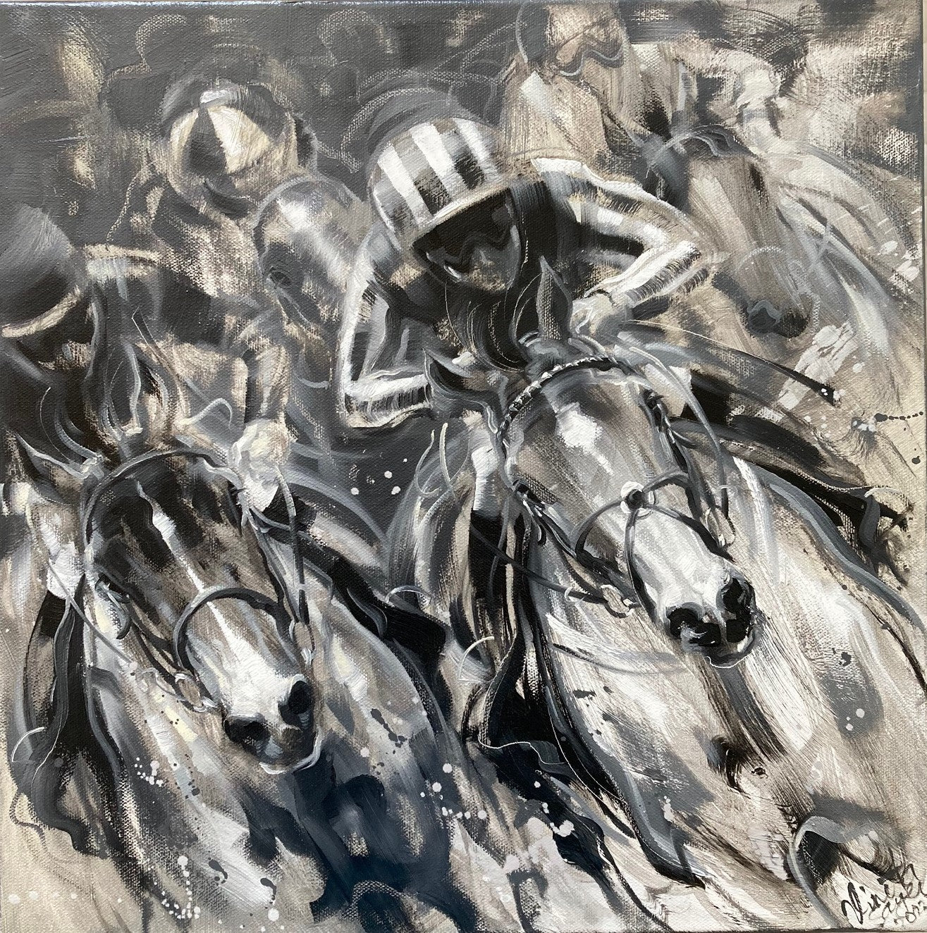 Battle Royal plunges you straight into the chaos and exhilaration of a tightly packed race, with horses surging shoulder‑to‑shoulder and jockeys folded low over their mounts. Sayer’s brushwork is vigorous and splintered, turning hooves, reins, and flying mud into a storm of movement that feels almost deafening. Her palette often swings between stark contrasts and sudden flashes of monochrome, heightening the sense of collision and competition. The result is a scene that feels less like a single moment and more like the raw, unfiltered force of the race itself.