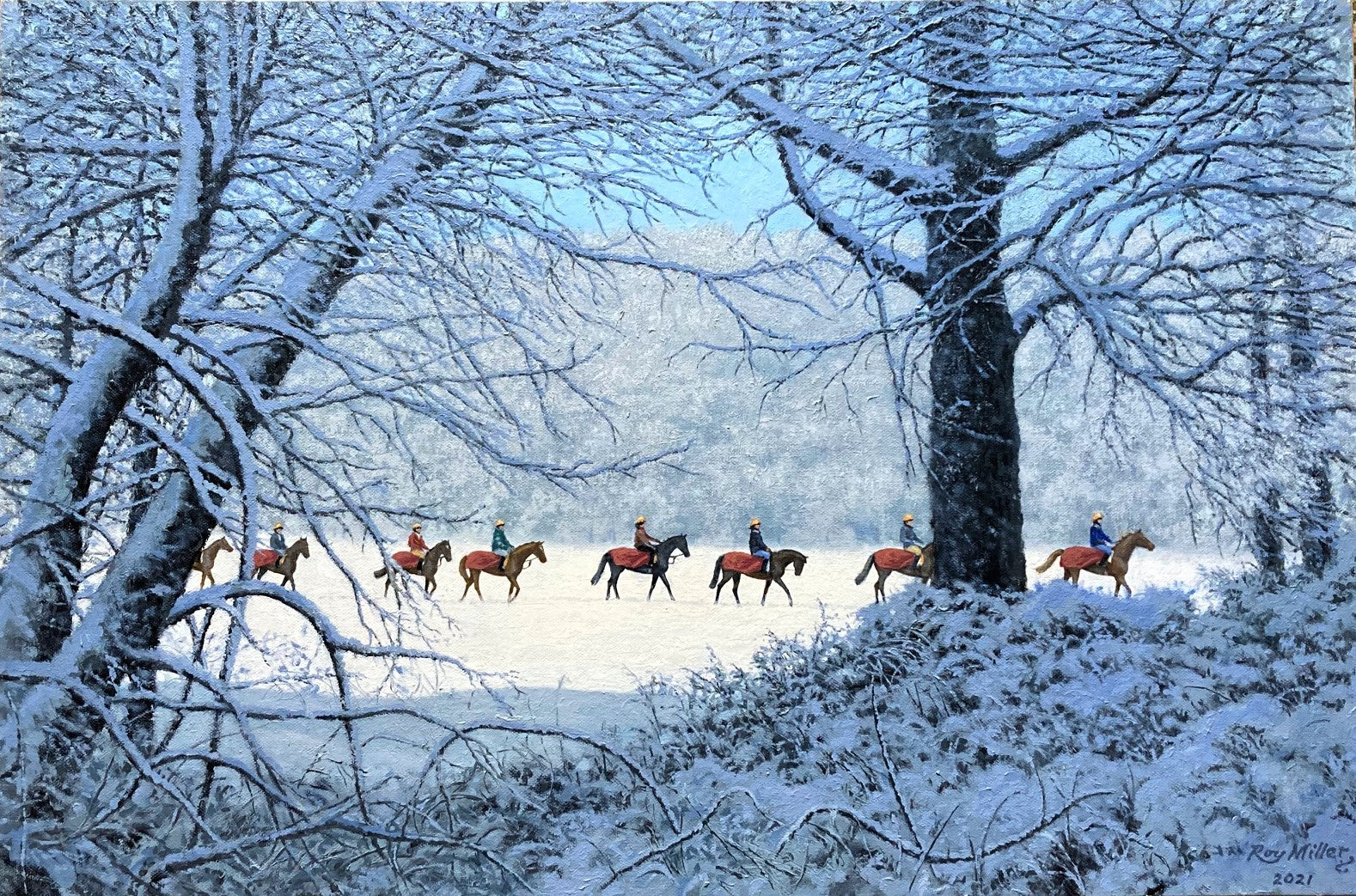 The painting captures the slow return home to the stables of racehorses after an early morning workout. Miller’s brushwork emphasizes both the physical presence of the animals and the atmosphere of calm routine, evoking the timeless rhythm of equestrian life.