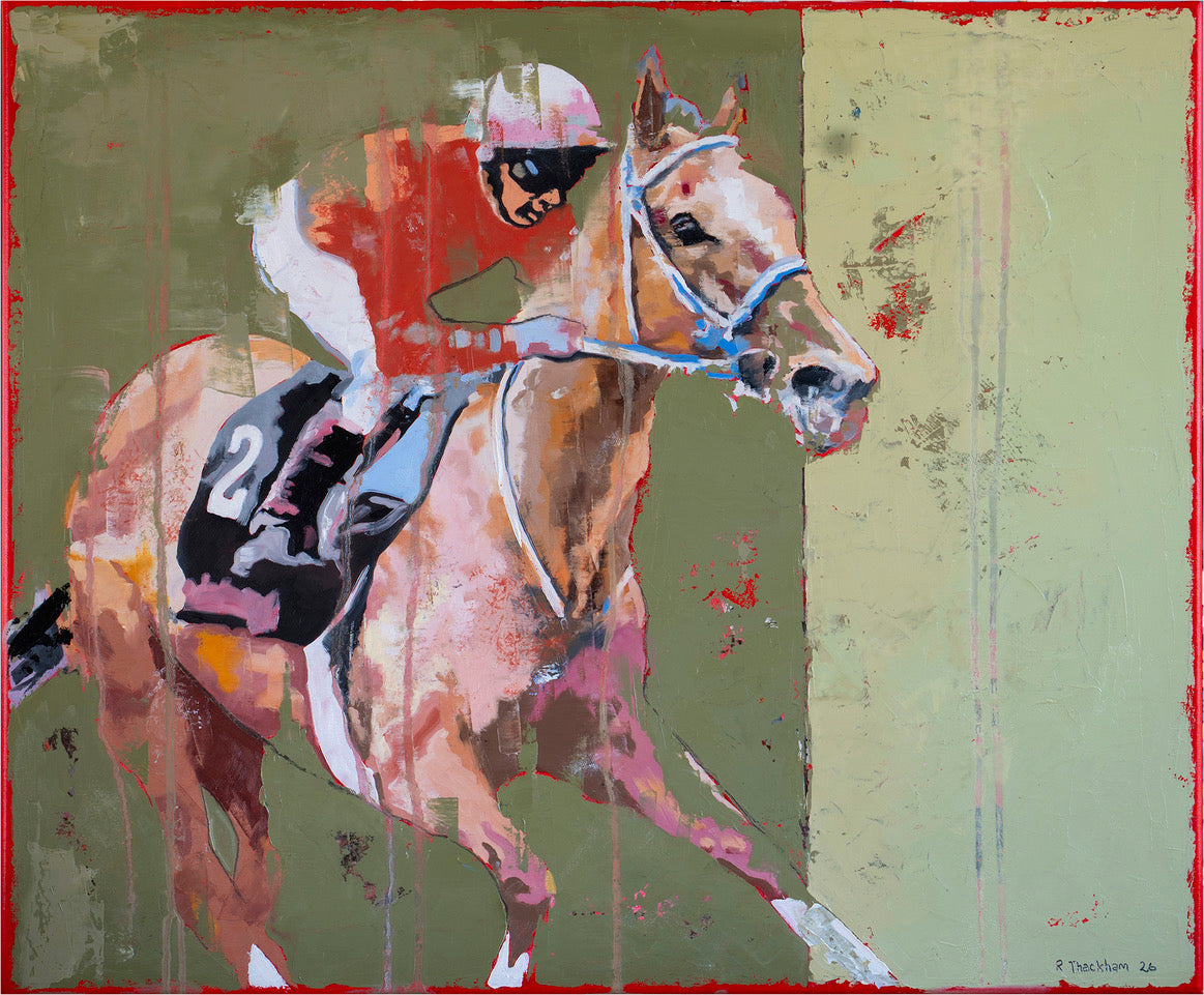 Richard Thackham’s By a Nose captures the split‑second drama of a race decided in the final stride. The horse is stretched to full extension, muscles taut, while the jockey leans low in a determined drive for the line. Thackham’s loose, energetic brushwork and vivid colours heighten the sense of speed, giving the whole scene a breathless, edge‑of‑victory tension.