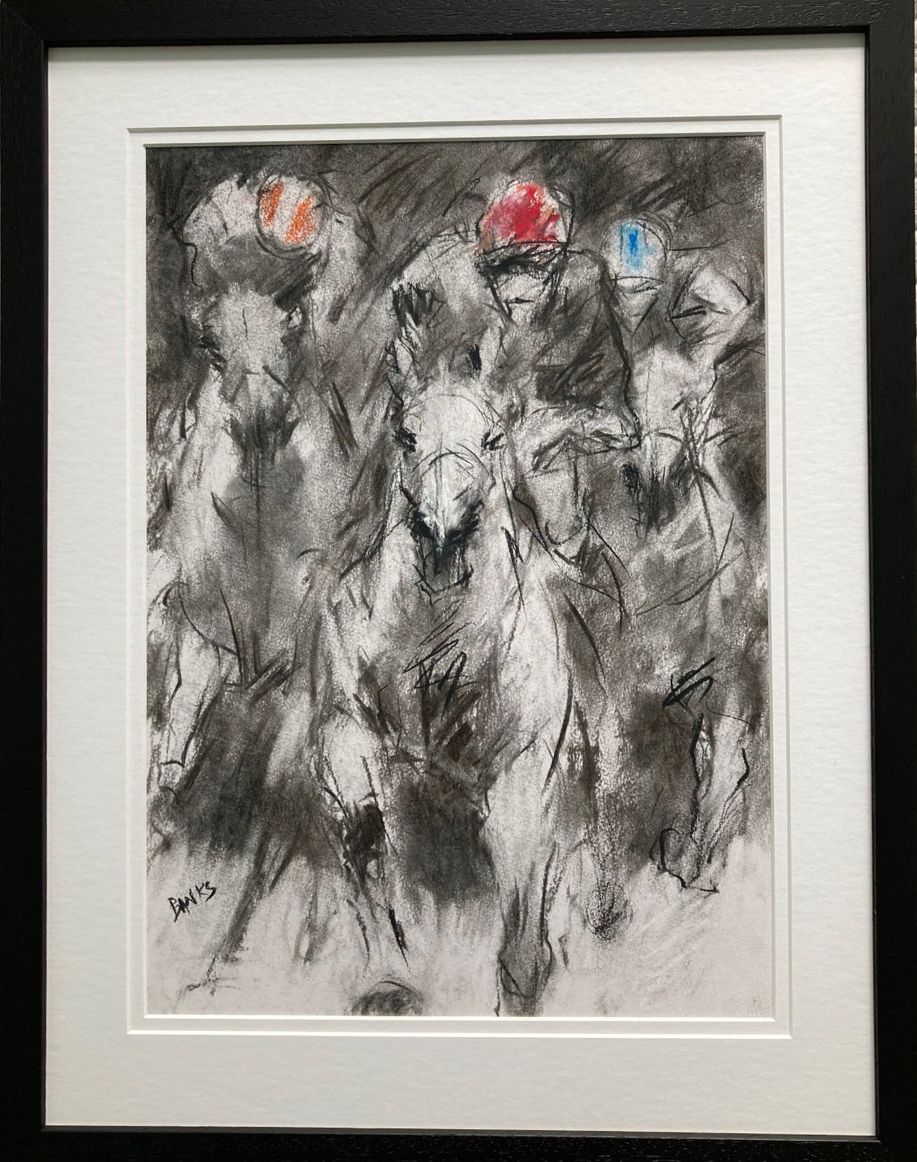 Alasdair Banks’s Candy Crush is a vibrant and energetic composition that exemplifies his signature fusion of expressive motion and bold color. The painting features a dynamic equestrian scene, where the horses and jockeys surge forward in a blur of movement, evoking the thrill of a race. True to its title, the piece is infused with candy-like hues—bright pinks, electric blues, and vivid oranges—that pop against the more subdued background, creating a playful yet intense visual rhythm. Banks’s loose, gestural style amplifies the sense of speed and spontaneity, making Candy Crush both a celebration of sport and a feast for the eyes.