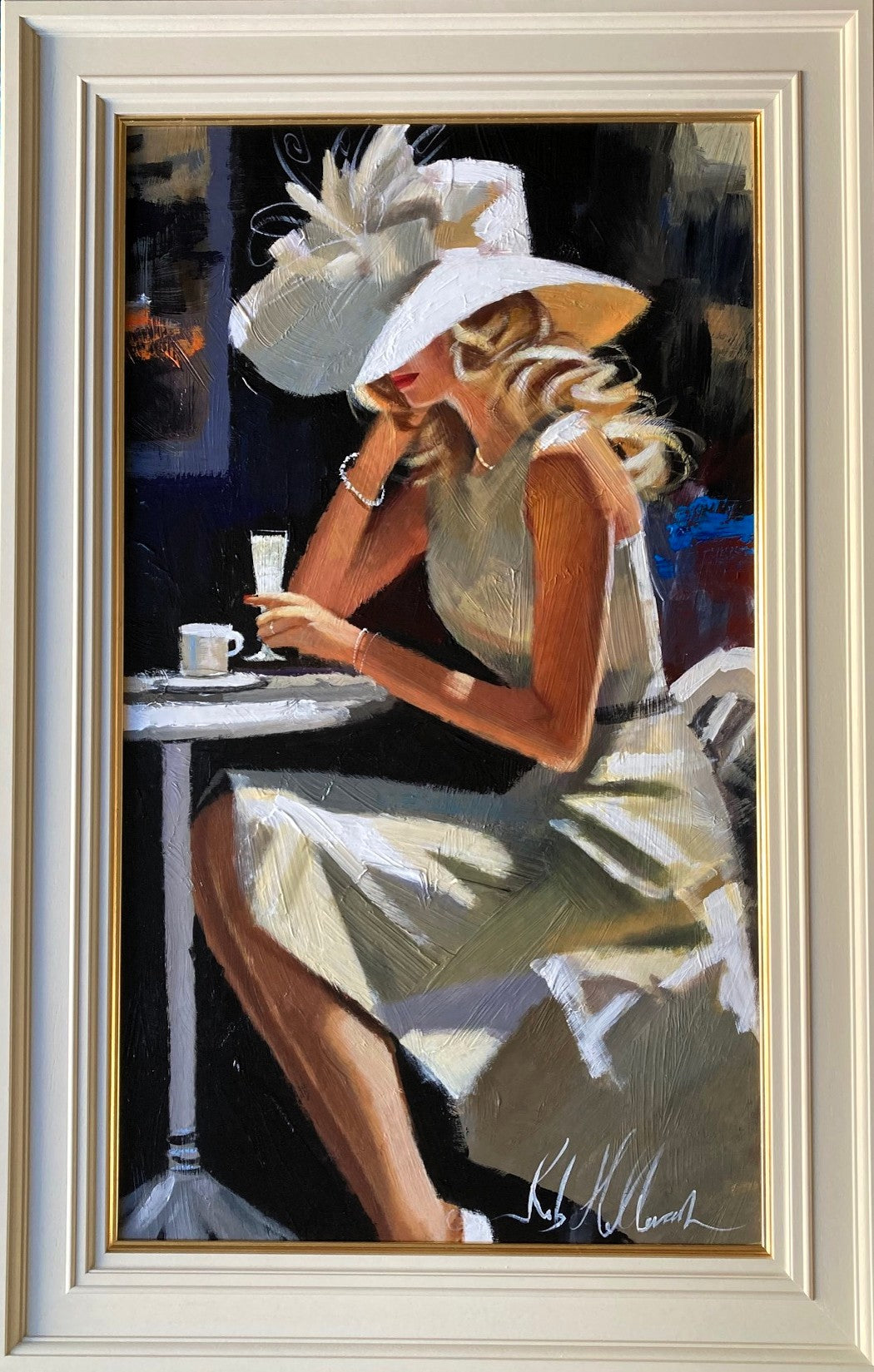 'Champagne Style' by Rob Hefferan, acrylic on canvas, framed in cream wood with gold trim, 42" x 27.5" (108 cm x 70 cm).
