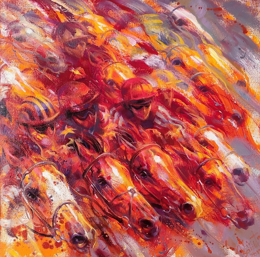 The painting Meteor Strike is a striking expressionist depiction of a horse race, created by Vineta Sayer MA in 2022. The artwork uses bold, fiery colours—reds, oranges, and yellows—to convey the intense energy and speed of the galloping horses. Their heads are prominently featured, with flaring nostrils and wide eyes, emphasizing their power and determination. The expressive brushstrokes create a dynamic sense of movement, making the viewer feel immersed in the action. The jockeys, dressed in colourful silks, add to the competitive atmosphere, making this piece a visually compelling representation of the thrill of horse racing.