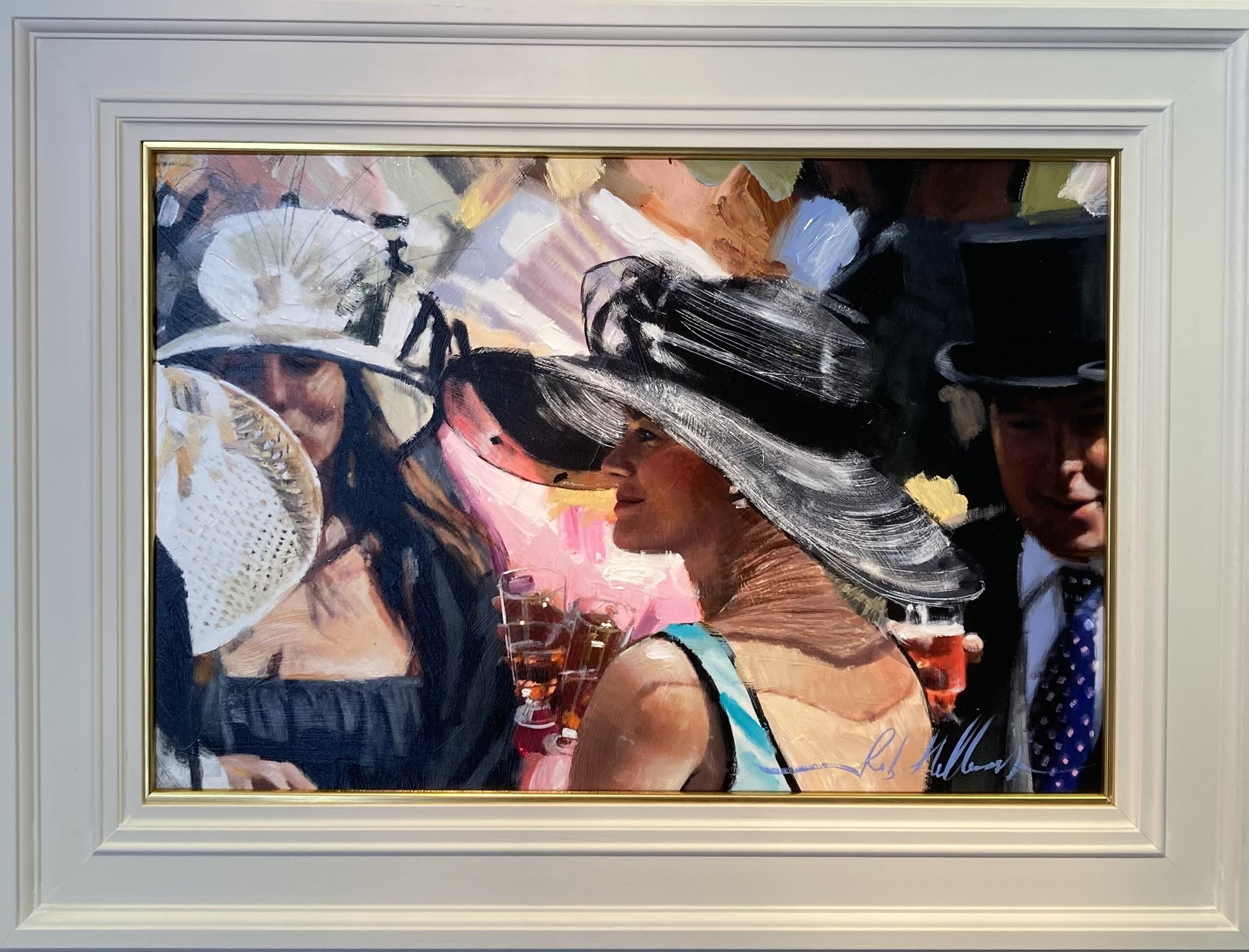 Painted in 2022 by Rob Hefferan, Dark Angel features an atmospheric Ascot or Goodwood garden party scene conjuring up the magic of a stylish celebration at the races.