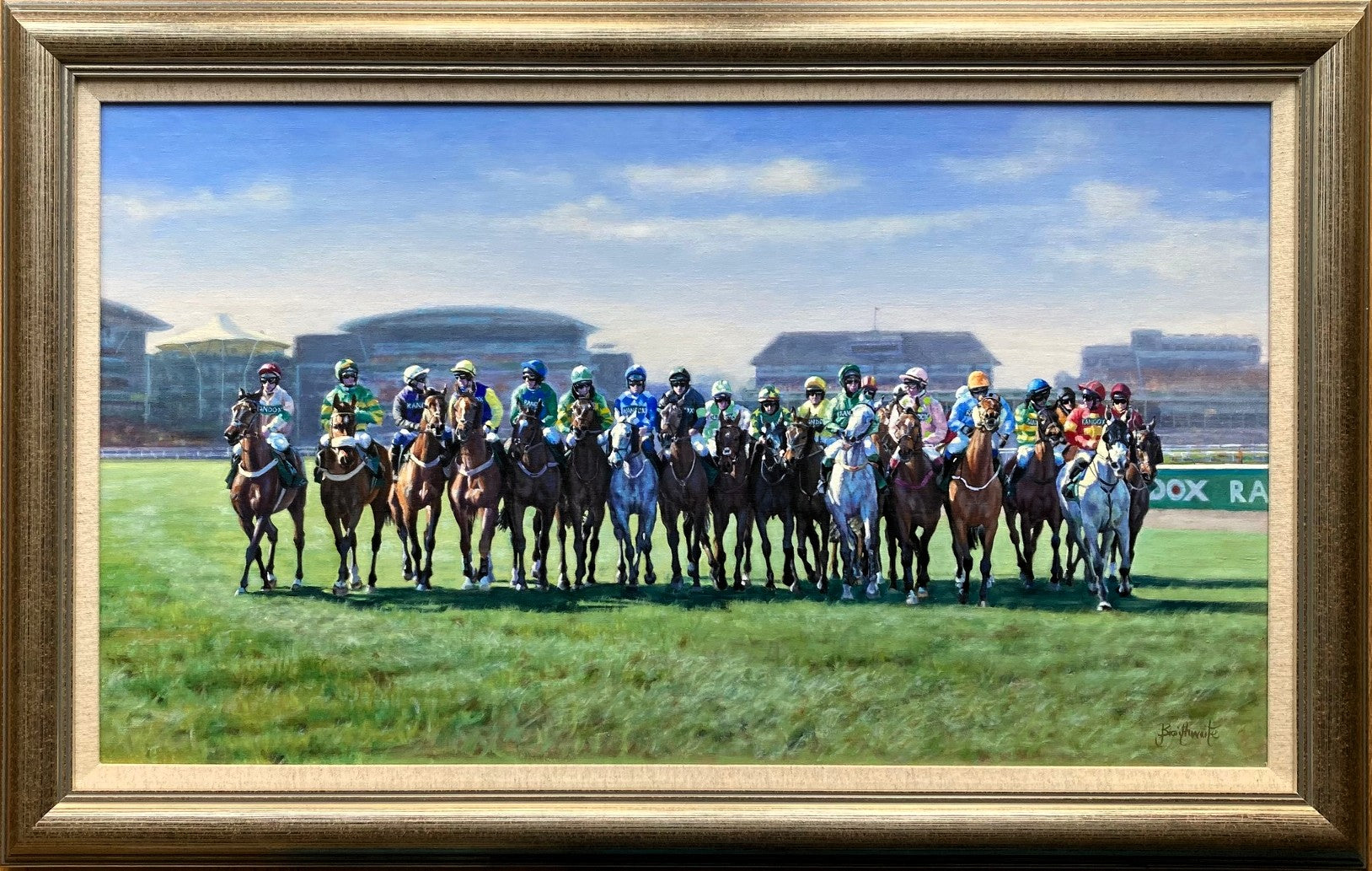 The 2025 Grand National painting titled Field of Dreams captures a moment of poised anticipation as racehorses and jockeys line up on a sunlit turf, ready to burst into action. With vivid colours and dynamic composition, the artwork evokes the thrill and tradition of one of Britain's most iconic sporting events. The silver frame adds a touch of elegance, reinforcing the grandeur and prestige of the scene. It's a celebration of competition, heritage, and the dreams that gallop across the grass at Aintree.