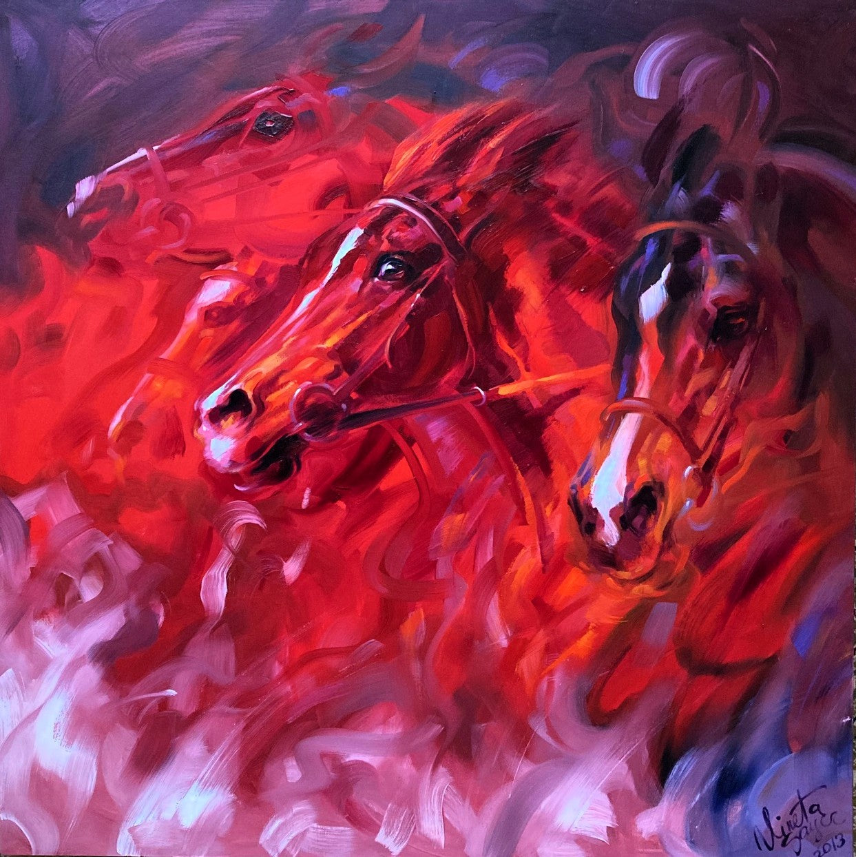 Vineta Sayer’s Furnace is painted in oils on box canvas, measuring 40 inches x 40 inches ( 100 cm x 100 cm). It is a vivid, high-energy horse racing painting that channels the raw intensity of the track. The work is dominated by fiery reds and molten tones, evoking both speed and heat, as if the horses are surging through a blaze. Her expressive brushwork captures the muscular drive of the animals, their forms almost dissolving into flame-like abstraction, which heightens the sense of urgency and power.