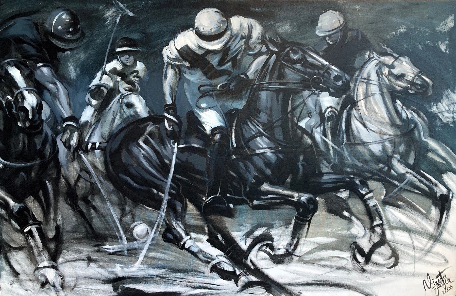 This powerful painting titled Last Gasp Attack captures the high-stakes intensity of a polo match in full motion. Rendered in sweeping brushstrokes and a dramatic monochromatic palette with cool undertones, the composition depicts a group of players and horses in a tight, dynamic struggle for the ball. The central figure, dressed in white, leans aggressively forward with mallet extended, while the surrounding players surge alongside, creating a whirlwind of energy and tension.