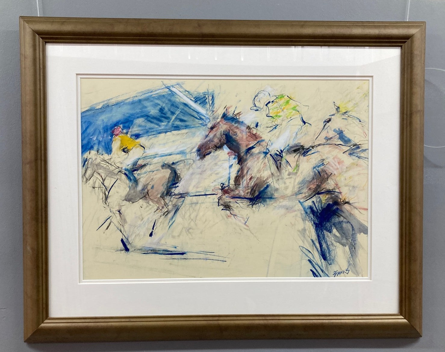 Alasdair Banks’s Grandstand Finish is a delightful minimalist composition depicting the final fence and run in to the finish in a style reminiscent of the great 20th century equine artist John Skeaping.
