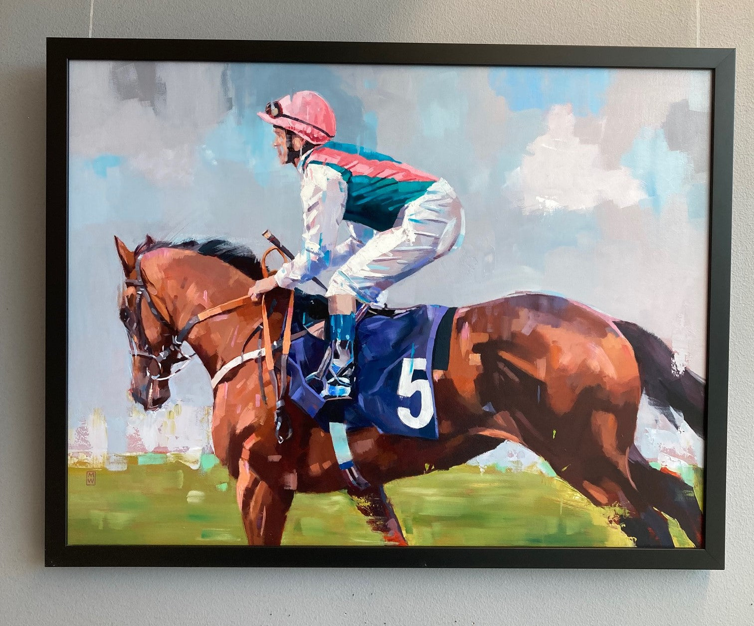 In Under Suffolk Skies, Martin Williams captures the fleeting drama of the racetrack with expressive brushstrokes and vivid colour. A jockey, adorned in pink and green silks, guides a powerful chestnut thoroughbred marked with number 5 across a luminous stretch of turf. The impressionist technique softens the motion into atmosphere, evoking the energy and elegance of flat racing beneath expansive East Anglian skies.