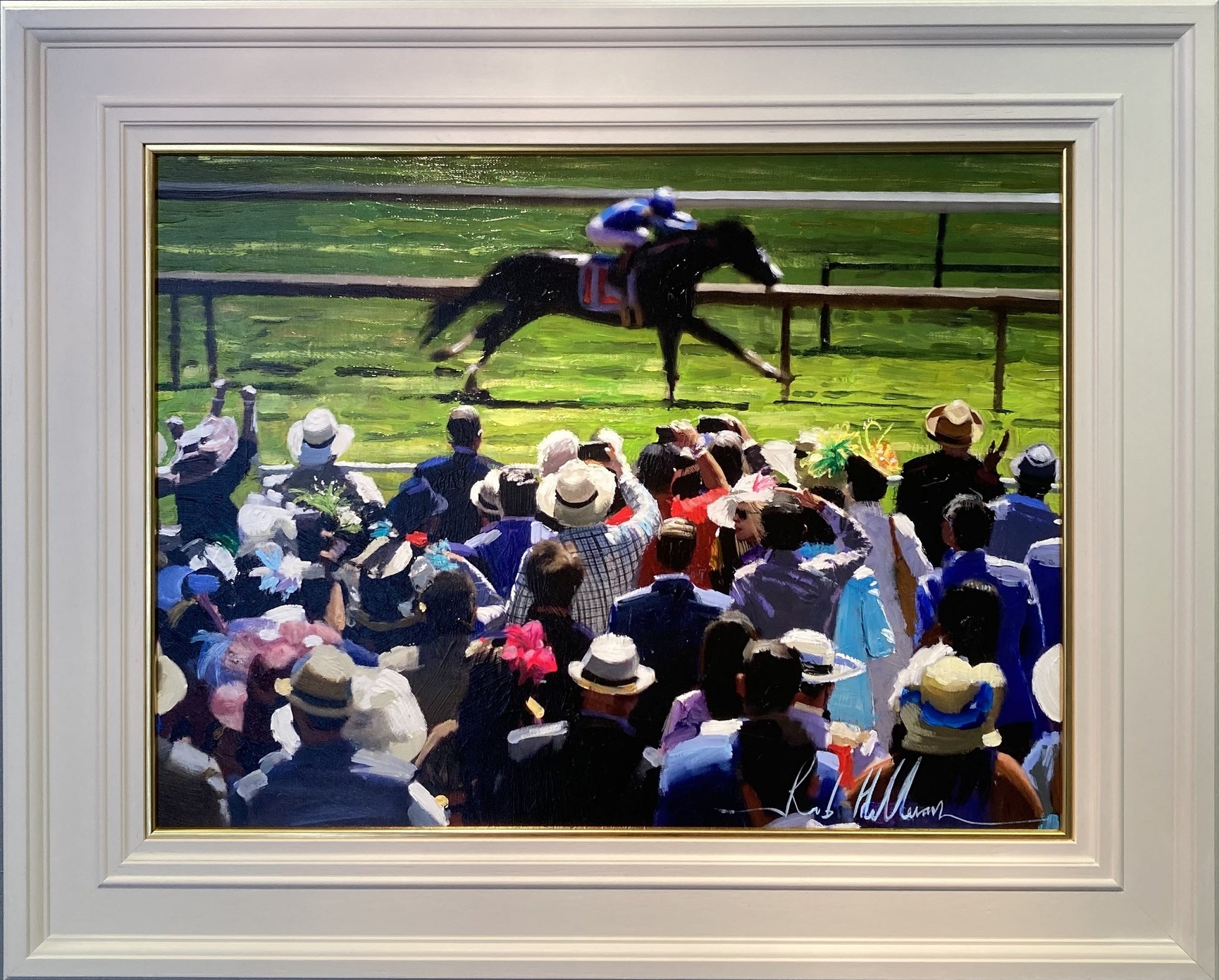 Painted in 2022 by Rob Hefferan, Hot Foot features an atmospheric racing scene conjuring up the magic of a stylish celebration at the races.