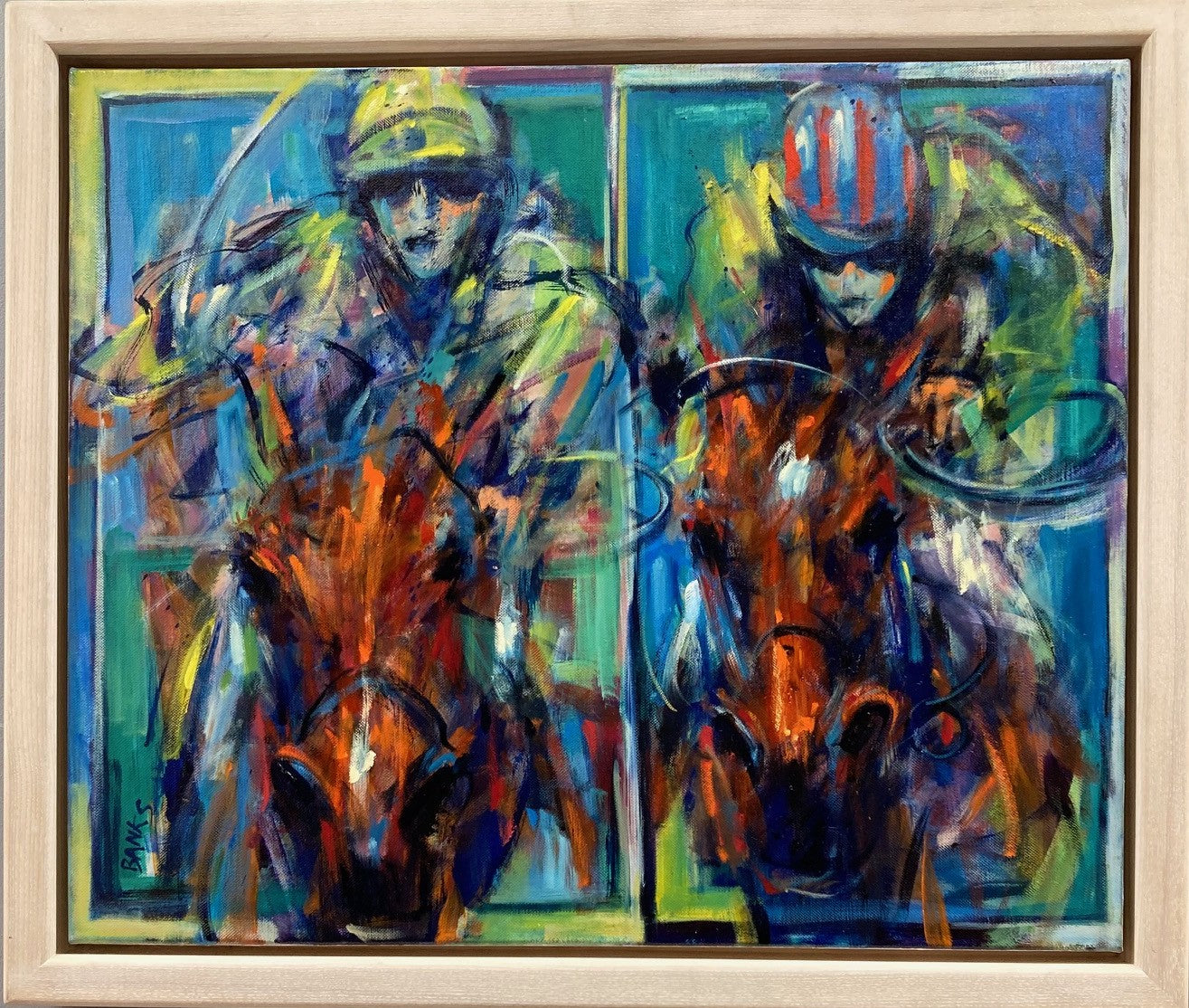 Hotspurs (2014) is a compact yet dynamic composition typical of Alasdair Banks that attempts to show the gladiatorial competitiveness of two racehorses exploding from the starting stalls, a favourite motif of the artist.