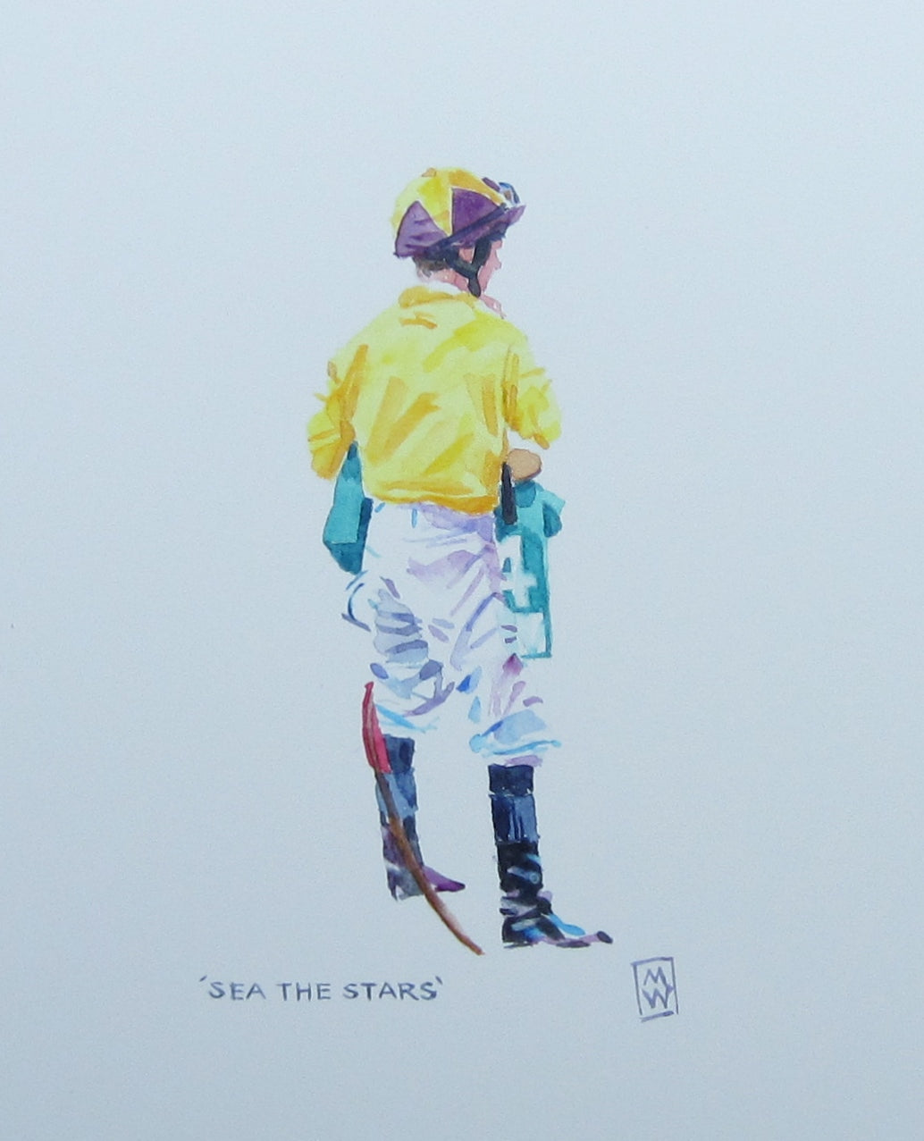 This evocative watercolour by Martin Williams captures the legendary Sea the Stars through the poised figure of a jockey in the horse’s distinctive racing silks. Painted with a minimalist impressionist touch, the composition focuses on quiet strength and enduring legacy, paying tribute to one of the greats in modern racing history.