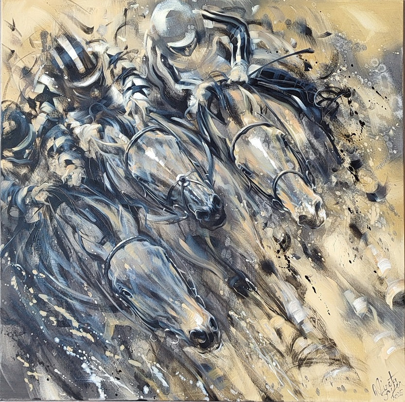 Vineta Sayer’s Spiral feels like a moment of motion caught mid‑breath. She builds the composition around a whirling, centrifugal energy, letting the horse’s form dissolve into sweeping arcs of colour and texture. The piece balances power and vulnerability: the animal’s body is recognisable, yet it seems to be pulled into an emotional vortex, as if movement itself is the subject. It’s one of those works where you sense the physicality of paint as much as the presence of the horse, creating a mood that’s both dynamic and introspective.