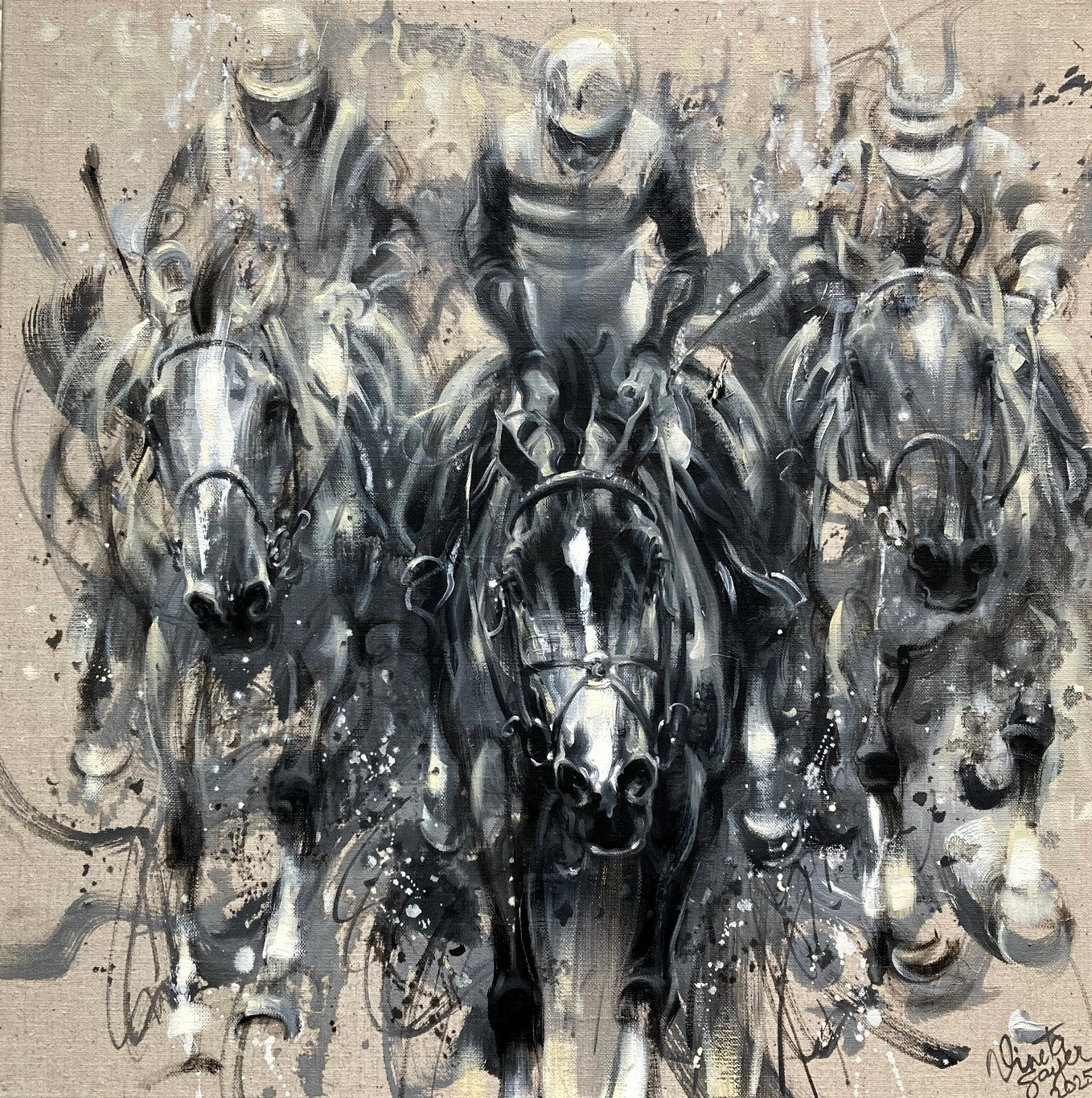 This electrifying painting by Vineta Sayer, titled Brush Work (2025), captures the raw energy and adrenaline of a horse race in full motion. The composition spirals inward with dramatic force, pulling the viewer into the thundering charge of the horses and jockeys. Sayer uses sweeping brushstrokes, splashes of paint, and a limited, palette to emphasize speed, grit, and intensity.