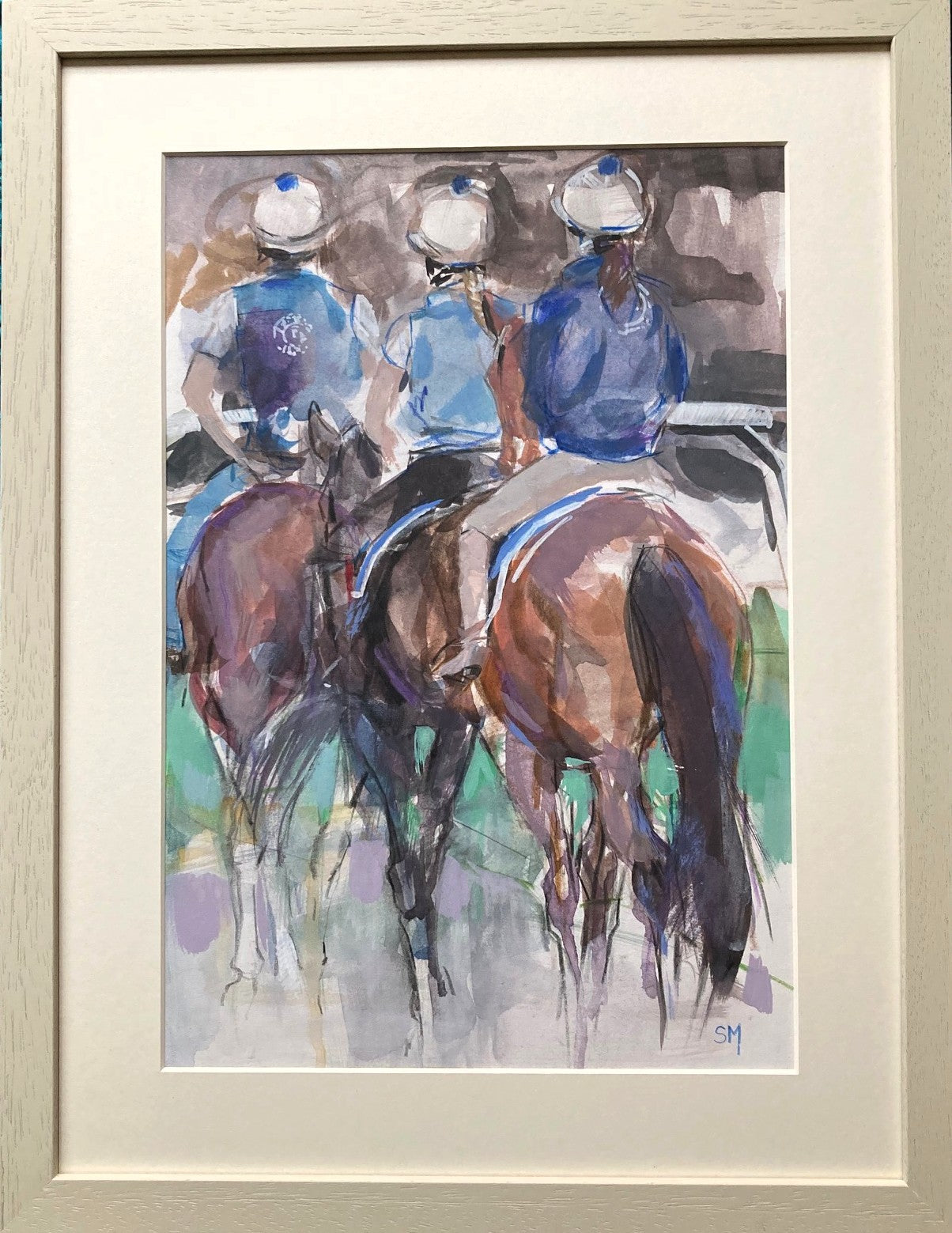 Trio is a quietly graceful study of three work riders on horseback, captured from behind as they move in unison through a muted, atmospheric landscape. The composition emphasizes companionship and rhythm, with Martin’s impressionistic brushwork lending softness and motion to the scene. Subtle tonal shifts and restrained detail evoke the early morning calm of training or leisure, inviting reflection on the bond between horse and rider