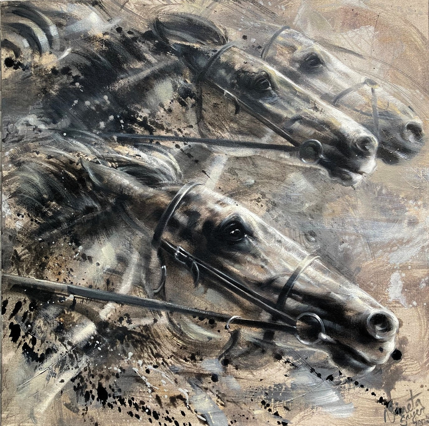 Triple Chance by Vineta Sayer depicts three racehorses surging forward in close formation, their heads and bridles overlapping to convey speed and intensity. Rendered in a muted palette of greys, browns, and blacks, the painting uses loose, expressive brushstrokes and splatters to suggest motion, dust, and the chaos of the race. The cropped composition and repeated forms heighten the sense of momentum and competition, capturing a fleeting moment of power and anticipation.
