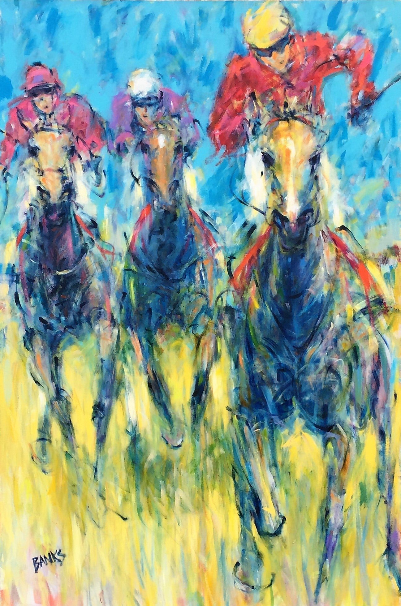 Painted in 2016, Up to the Challenge is a pulsating and visceral evocation of the racetrack by celebrated artist Alasdair Banks. Executed in bold, pastel hues of of crimson, lilac, cobalt, and lemon yellow, the painting captures a group of racehorses thundering forward.