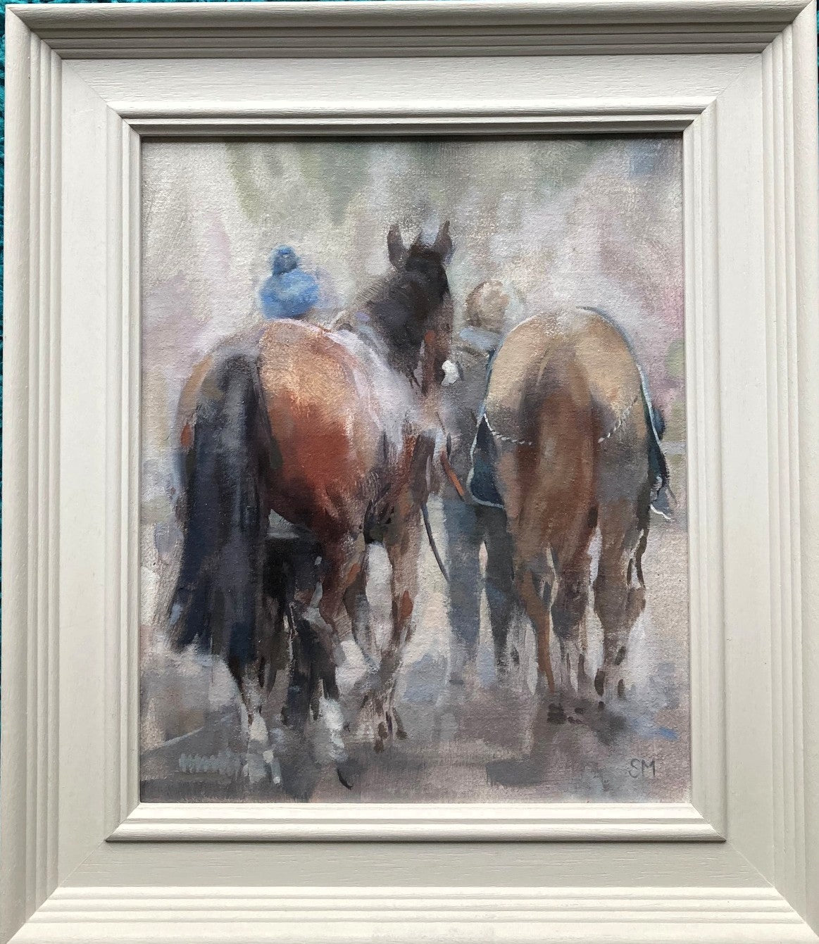 With her signature impressionistic style, Martin uses soft brushwork and muted tones to suggest a moment suspended in time, where light and steam blur the boundaries between horse, handler, and landscape. The composition emphasizes mood over detail, inviting viewers to feel the warmth, movement, and connection within the scene.