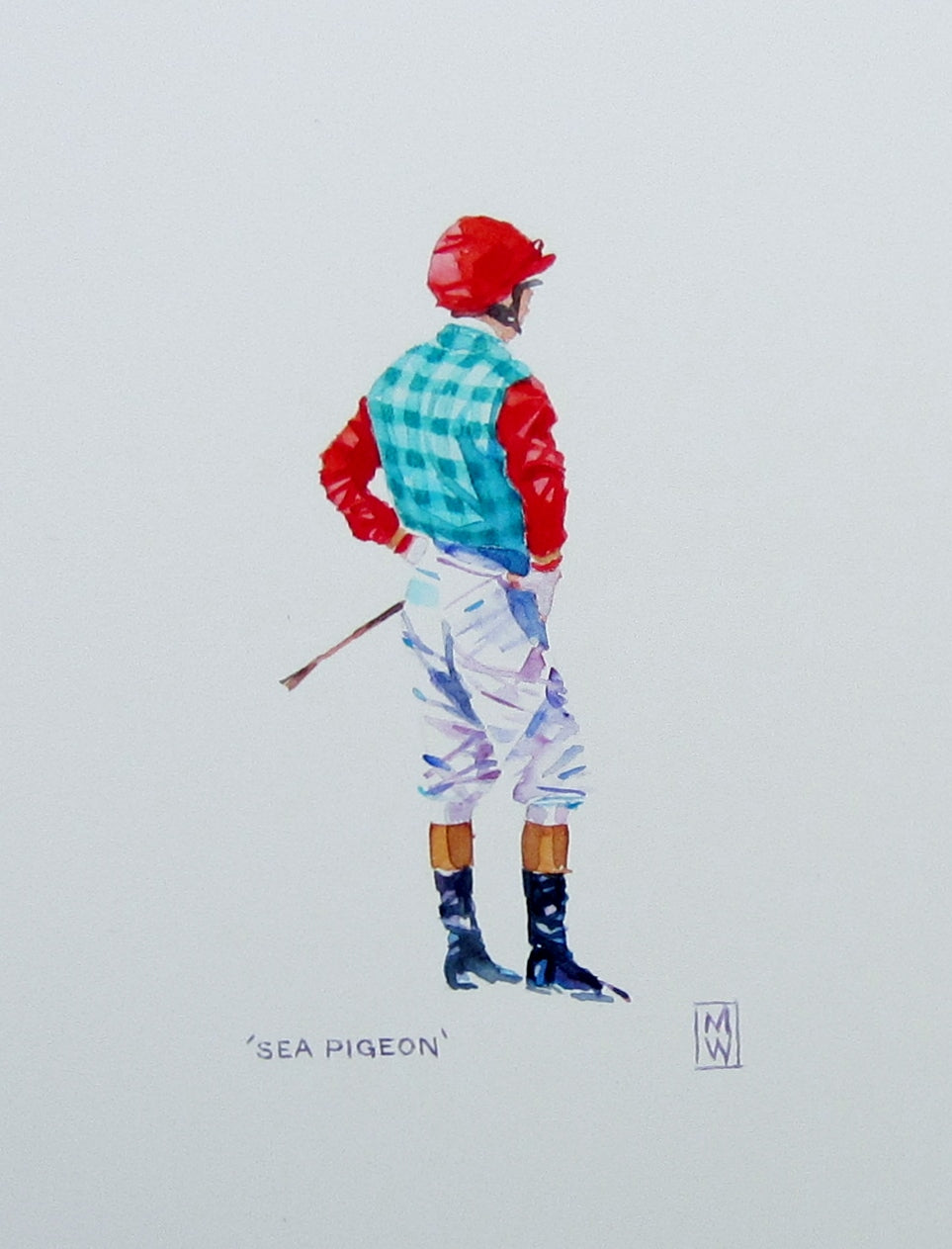 This evocative watercolour by Martin Williams captures the legendary Sea Pigeon through the poised figure of a jockey in the horse’s distinctive racing silks. Painted with a minimalist impressionist touch, the composition focuses on quiet strength and enduring legacy, paying tribute to one of the greats in modern racing history.