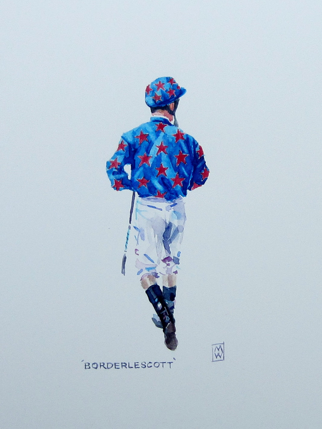 This evocative watercolour by Martin Williams captures the legendary Borderlescott through the poised figure of a jockey in the horse’s distinctive racing silks. Painted with a minimalist impressionist touch, the composition focuses on quiet strength and enduring legacy, paying tribute to one of the greats in modern racing history.